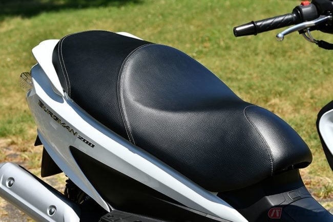 気軽に乗って、狭いところもスイスイ行けるのが、本来の持ち味のはずなのに、当時は大きいほど良しとされていた風潮もあったと記憶しています。その点、「バーグマン200」はちょうどいい。ライディングポジションもジャストフィットし、大きすぎず窮屈でもありません。シート高は735mmと低く、身長175cmの筆者(青木タカオ)の場合、両足カカトまでベッタリ地面に届きます。