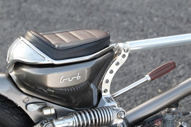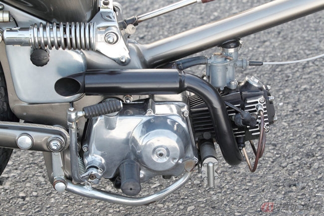 1964年式の『C65』、つまりは初代OHCカブをベースにしたこのマシンは、メインフレームを前方へ大きくストレッチ(延長)することで、低く身構えたドラッグレーサーやランドスピード(水が干上がった巨大な塩湖や砂漠で行われる最高速競技)レーサーのようなフォルムとなっていますが、ステムとシート下の間にサブフレームを備え、スタイル的なアクセントを追加。