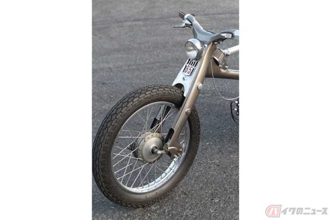 その他、ディテールを見ても自動遠心クラッチの構造を生かしたハンドシフトや、あえて『カモメ型』のハンドルを残したフロント周り、ナショナル製のビンテージ自転車から流用したというヘッドライトなどにビルダーである釘崎仁氏の高いセンスを感じます。