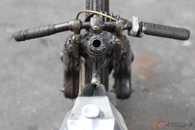 あたかもヴィンテージのガス燈を横たわらせたようなデザインのガソリンタンクや、本来ヘッドライトがあるべき箇所に取り付けられたホーン、そしてエンジン前方に備えられたヘッドライトなど、その発想の数々は心の底から湧き起こる創作意欲を、そのまま素直に具現化したかのような雰囲気を漂わせており、対峙したスタンスは芸術家のソレに近いのかもしれません。