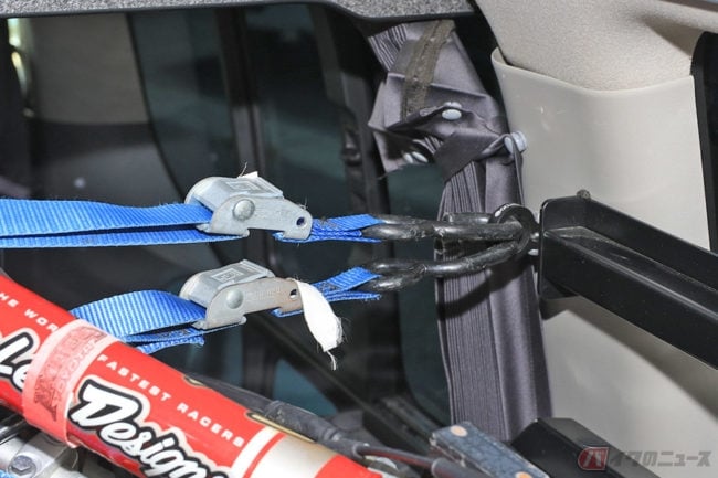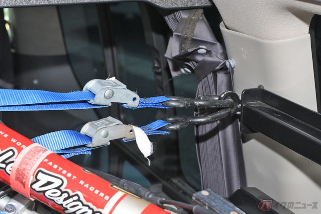 トランポにバイクを載せたら、次にタイダウンベルトをバイクとフックに掛けて締め付け固定しますが、このフックの強度と設置場所は非常に重要です。