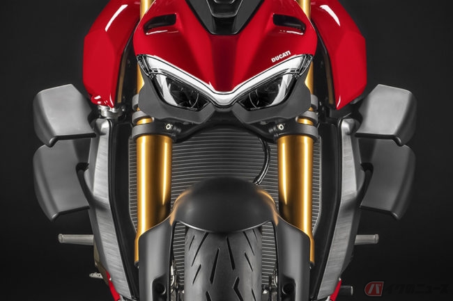 ミニマリズムを体現したフルLEDヘッドライトには、パニガーレV4とスーパースポーツに採用されているV字型の「デイタイム・ランニング・ライト(DRL)」を備え、その特徴的なフロントマスクはデザイナーがコミックのキャラクター「ジョーカー」の不気味な笑顔にインスピレーションを得た造形となっています。