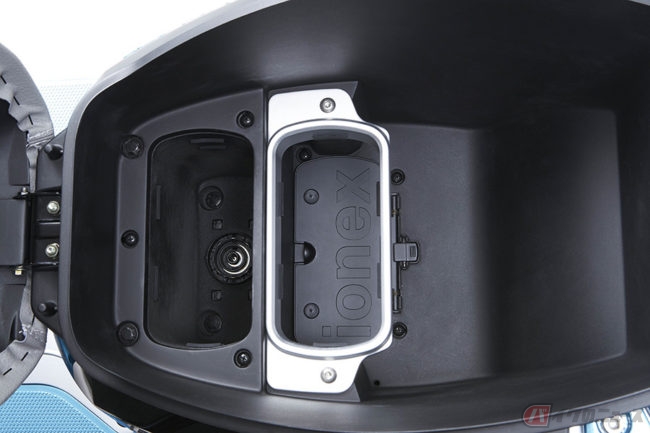 キムコ独自の交換式「Ionex(アイオネックス)バッテリー」(重量:6kg)を2個搭載できる「i-One DX」は、最大90kmの移動が可能で、最高速度は74km/hに到達します。また、バッテリーが1個の状態でも走行可能なため、シート下の収納スペースを利用する際には1個、長距離を移動する際は2個と、ライダーの使用用途によりバッテリーの数を増減させることが可能です。