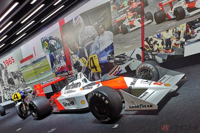 展示のモデルも最新のMotoGPマシンはもちろんのこと、1985年、フレディ・スペンサーのNSR500、またその隣には1988年、アイルトン・セナのマクラーレンMP4/4と、この2台、いやこのカラー2台を並べるところなど、胸に去来するモノがあり、グッとさせてくれました。