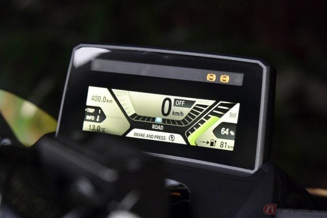 特徴的なのは、驚くほどバイクが重いことです。94Ahのリチウムイオン電池バッテリーはけして軽くはありません。車重は275kgにも達します。ですので、慣れるまではヒラヒラと舞うように走れませんでした。