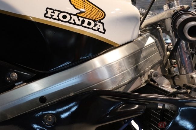メインフレームは、極太の異形5角形断面材を使用した、ホンダ独自のアルミ・ツインチューブ・バックボーンフレームを採用。また、アルミ製燃料タンクを装備し、フェアリングも繊維強化プラスチック(FRP)製とするなど軽量化がはかられています。