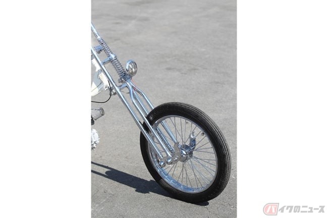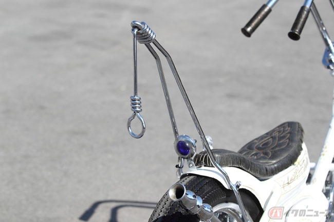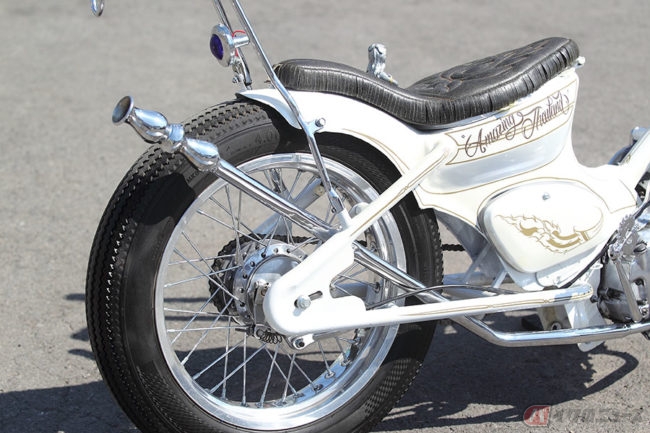 加えてこのマシンは見た目のデザインのみならず、「楽しい乗り味」を求めたものとのことで、エンジンはより信頼性の高い1997年式のホンダWAVE100のものへ換装。ジョッキータイプのハンドシフトとされた操作系と相まって狙い通りのライディング・アクティビティーを見せつけるに至っています。また車体全体に施された“ Loser Custom paint Pinstriping”による美しいピンストライピングもチョッパーらしさを強調する見事なものです。