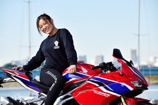 「私がやっている総合格闘技でも、パンチやキック、そして寝技にしても、威力を発揮するには体幹が強いことが絶対条件です。止まっているバイクに乗せてもらって、曲がるときの動きを教えてもらっただけですが、想像していた以上に体幹を使うことを実感しました。みなさんもきっと、トレーニングすれば、うまくバイクをコントロールできるようになると思います。お互いに頑張りましょう!」