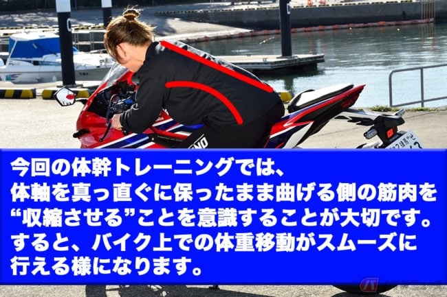 「このトレーニング、私も最初は脇腹が“伸びているなぁ”と感じました。しかし、“反対側の筋肉が縮んで力を出しているから逆が伸びる”ということを意識し始めたら、筋肉の使い方や連携が実感できるようになってきました。総合格闘技の技でも、練習のときはどこをどう動かすかを考えながらやることが大切です。バイクのコントロールも、きっとそれと同じ何でしょうね」