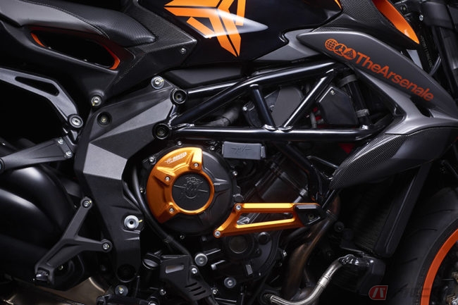 TheArsenaleはこれまでにもメイド・イン・イタリアの高級素材メーカー「アルカンターラ社」などともコラボしてきましたが、今回のMVアグスタとのコラボではスポーツネイキッド「Dragster 800 RR」をベースに、TheArsenaleのアイデンティティを視覚的に表すためディテールをオレンジとブラックで統一。Dragster 800 RRの持つキャラクターをより際立たせるよう、カラー・デザインされています。
