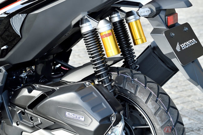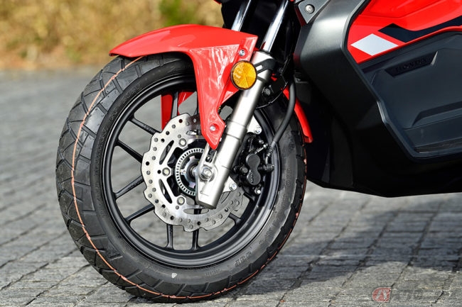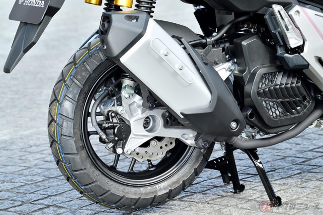 ADV150はタンク容量こそPCX150と同じ8リットルのままですが、足まわりはサスペンションストロークが長くなり、タイヤサイズがPCXとは異なるなど、外装だけでなく装備もしっかりアドベンチャーしています。