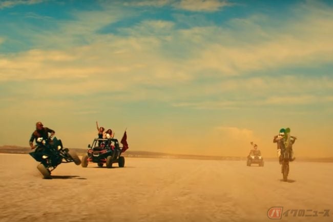 砂漠の民のキレキレなダンスやRaptorやKX250Fが旗をなびかせ砂漠を疾走するシーン、ウィリーや片輪走行などのバイクアクションなど、ビートに合わせて短く印象的なシーンを次々とつなげていく、中毒性の高い映像からは最後まで目を離すことができません。このMVより少し前に公開され、アカデミー賞で最多となる6部門で賞を獲得した大ヒット映画「マッドマックス 怒りのデス・ロード」へのオマージュとも思えるシーンが、ところどころにちりばめられている点も見逃し厳禁。映画を観たことのある人にとっては、そんな場面を探すのも楽しみのひとつとなるでしょう。