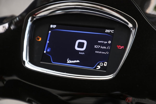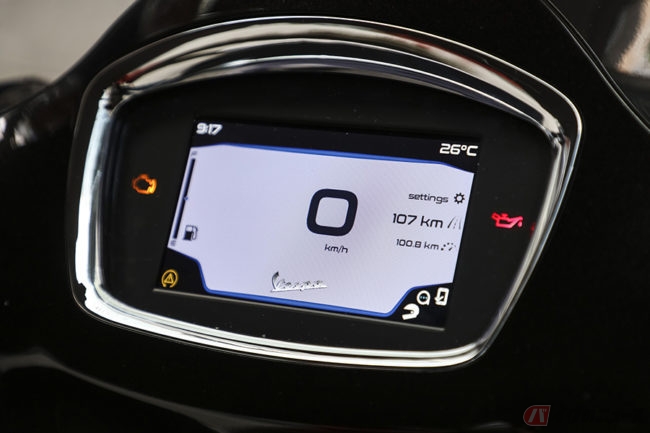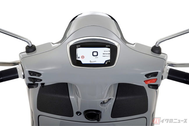 どこから見てもベスパと分かるデザインは継承しつつ、4.3インチ・フルカラーTFTディスプレイのフルデジタルメーターパネルを搭載し、灯火類はフルLED化され、新型エンジンのクランクケースカバーや車体反対側のサイレンサーカバーもベスパらしいフォルムを演出する新デザインとなっています。