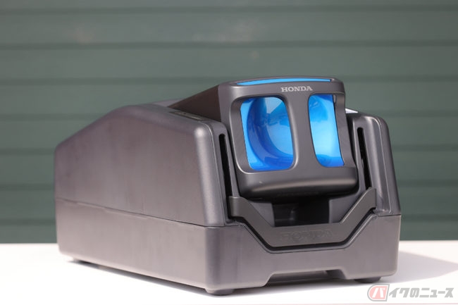 「ホンダモバイルパワーパック」と名付けられたリチウムイオンバッテリーは重量約10kg。シート下に2つ収納され、脱着してAC100Vまたは200Vコンセントに対応する専用充電器で残量ゼロから約4時間でフル充電が完了します。電池残量は、デジタルメーターで常時目視できます。