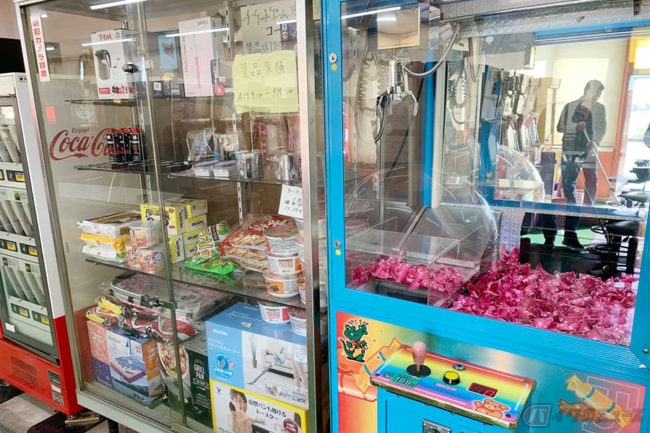 小腹が満たされたところで店内を見渡すと、ガヤガヤ音がする一画があります。ここにはゲームコーナーも隣接されているのです。平日の昼下がり、ご年配の方が一人、遊んでいました。UFOキャッチャーもあります。