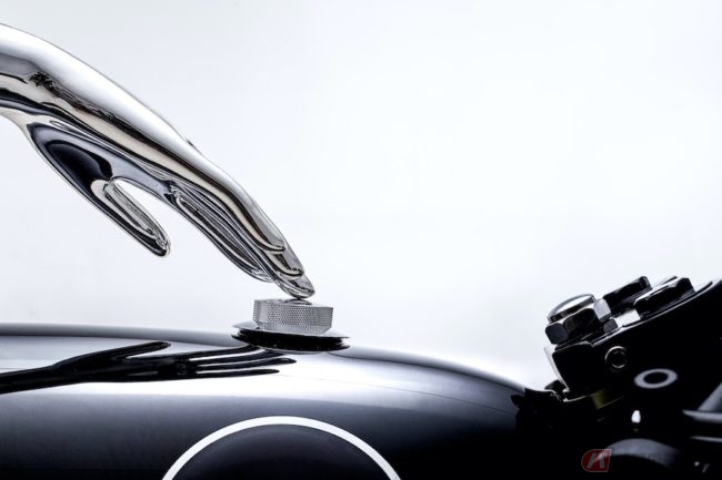さらに、アルミニウム製リム、カスタムフロントフォーク、ハンドメイドのアルミニウム製レバーとフットペグ、カスタムスピードメーター、LEDヘッドライト、貴賓溢れるティアドロップレザーサドルなどが美しく作り込まれており、目を引くステンレススチール製ユニボディタンクの上には、ブラックとクロームの超光沢仕上げが施され、ゴールドのピンストライプでデザインを引き締めています。