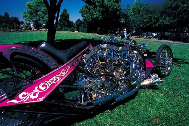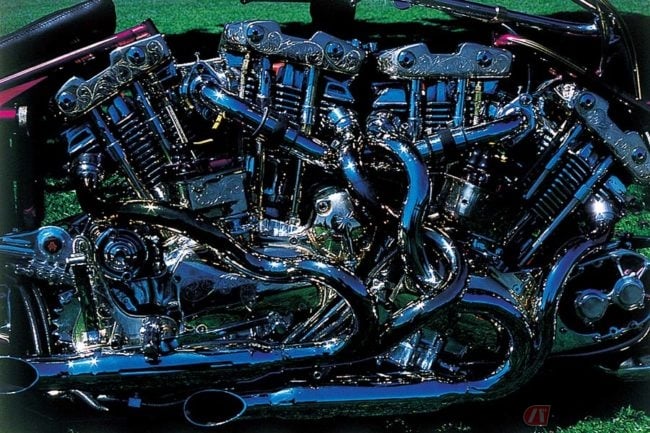 一般的なカスタムバイクが足回りの強化やパワーアップなどの性能向上を求める一方、そこに『装飾性』や『オリジナリティ』をプラスし、極論を言えば「パフォーマンス」を犠牲にしてでも「芸術的な美しさ」が追及されたもの……アメリカで生まれたチョッパーというカスタム・カルチャーには、そうした側面があるのですが、その中で『究極』の部類に入るマシンがここに紹介する「Two Bad」であることは間違いありません。