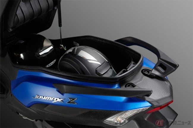 JOYMAX Z250ではそうした流れを踏まえ、コンパクトなスタイルとされていますが、シート下の収納スペースはフルフェイスヘルメットが 2 個入る大容量な設計となっています。