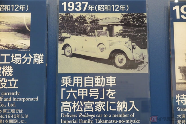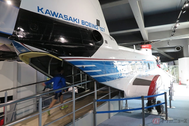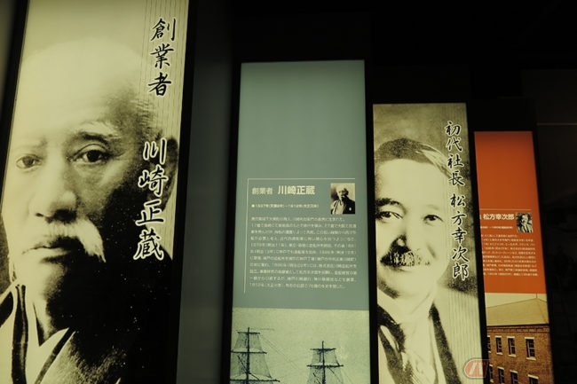 続いて株式会社川崎造船所の初代社長・松方幸次郎の写真。そして船、蒸気機関車、飛行機、四輪自動車、ヘリコプター、橋梁、ロボット、トンネル掘削機、ジェットスキー、オートバイなど、川崎重工業の多角的な製品を次々に写真で紹介しています。