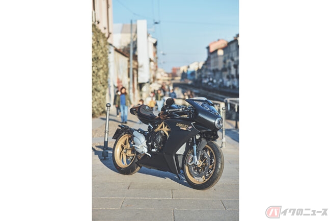 今回新たに発表された新色は、ゴールドのフレームをメインにしたもので、外装色はブラックとMVアグスタ伝統のレッド×シルバーの2色とされています。また、世界限定300台の「SUPERVELOCE 800 Serie Oro」とは異なり、ホイールもゴールドのアルミ製が備えられています。