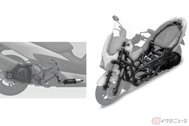 同じモデル名を掲げる「400」と「200」ですが、その違いはエンジン排気量のみではなく、車体構成やデザイン、収納力にも現れており、走行性能を高めるためにリンク式モノショックリアサスペンションを車体下部に備えた「400」では引き締まった車体デザイン、フルフェイスヘルメット2つを収納できるシート下スペースを備えた「200」では全体的にワイドでボリューム感のある外観とされています。