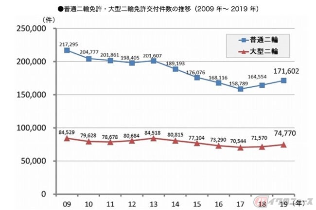 今回更新されたデータは、過去の統計にも遡り、2009年から2019年までの11年間について、普通二輪免許と大型二輪免許の交付件数(新規免許+併記免許=その年の当該免許取得件数とみなす)を集計し整理したものです。