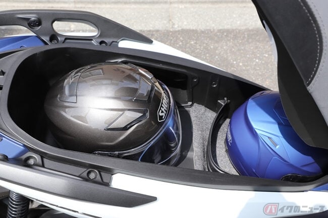 スクーターにとって大切なシート下のラゲッジスペースも、フルフェイスヘルメットを2つ入れてまだ余裕があるくらい大容量です。これはさすがに125ccや150ccクラスのスクーターには真似できません。250ccクラスならではの、ゆとりのスペースを確保しています。