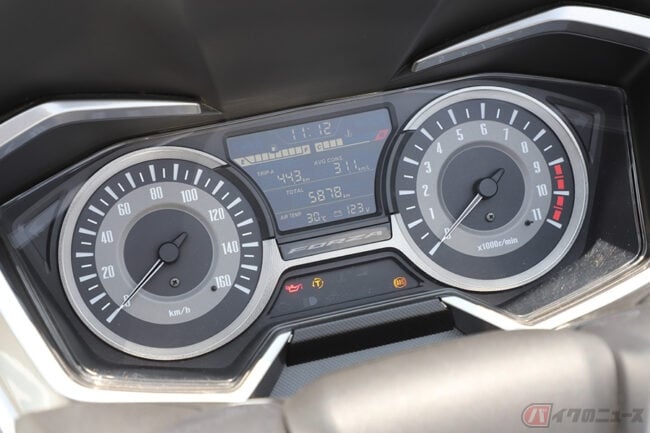 外観も、以前は少し丸みを帯びた流線形が主流でしたが、いまのフォルツァはエッジの効いたシュッとしたデザインです。しかも、ヘッドライトをはじめとする灯火類はすべてLEDとなっており、近未来的なイメージに仕上がっています。