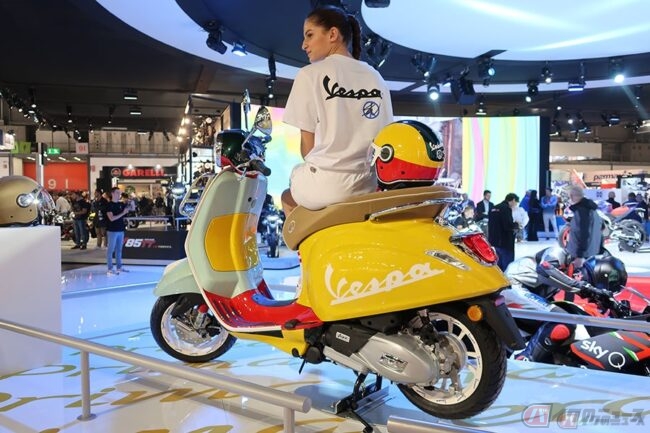 2019年11月にイタリア・ミラノで開催されたバイクの見本市「EICMA(エイクマ)2019」で公開された「Vespa PRIMAVERA Sean Wotherspoon」は、プリマベーラのスチールボディをキャンバスに、黄色、赤、ダークグリーン、シーグリーンなどトレンドを先取りしたカラーを配色。ステアリングコラムカバー(通称:ネクタイ)とホイールにホワイトをあしらった上で、ホイールリムにベスパのロゴをエンボス加工することで特別な一台とされています。