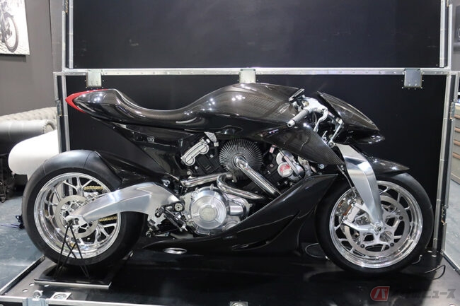 イタリア・ミラノで開催されたバイクの見本市「EICMA(エイクマ)2019」で発表され話題を集めたAMB001は、最高出力180馬力を発揮する排気量997ccのDOHCターボチャージャー付きVツインエンジンを搭載したレース用バイクです。