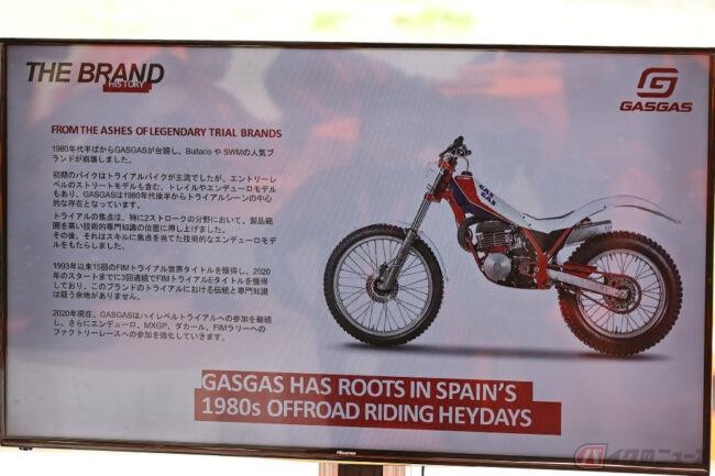1980年代半ばにスペインで創業したバイクメーカー「GASGAS(ガスガス)」は、1980年代後半からトライアルシーンの中心的なブランドへと成長を遂げ、1993年以降15回ものFIMトライアル世界タイトルを獲得し、その確固たる地位を築き上げたトライアルマシンのイメージが強いブランドです。