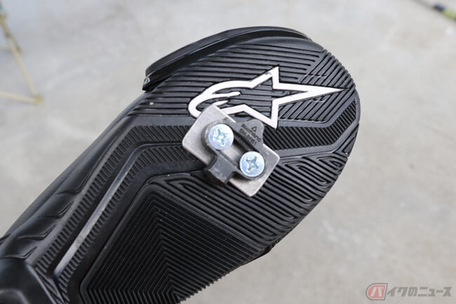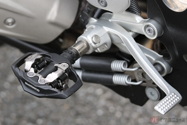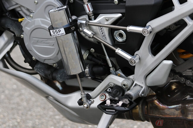 じつは、意外なことにバイク自体は非常にシンプルです。改造のポイントは大まかには2点のみ。シフトペダルにアクチュエーターが取り付けられ、シフトチェンジが手元のスイッチで行えるようになっていることと、足がステップから外れないよう、固定器具が取り付けられていることだけなのです。それ以外は、一般的なバイクとなんら変わりはありません。