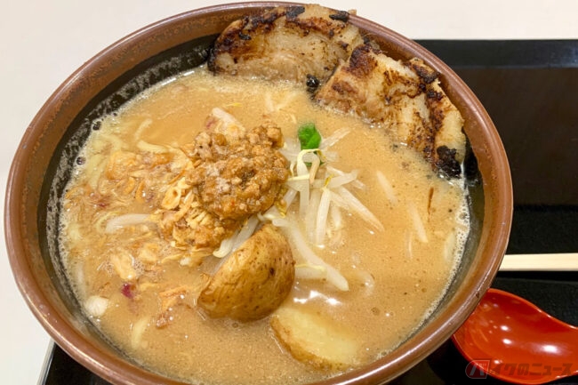 コクの深い味噌スープになぜかゴロッとしたフライドポテトが載せられ、北海道を思わせる演出かと思いきや、食してみるとスープの味に合わせたトッピングだと気づきます。