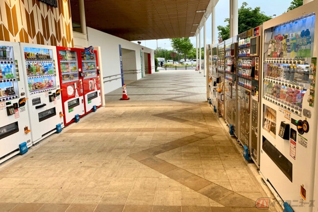 「酒々井PA」には、パーキングエリアながらガソリンスタンドもあり、二輪駐輪スペースも広めに確保されています。カームダウンスペース(人目や音を遮った部屋)やATMなど、施設としても充実しています。自販機も多数並んでいるので、お気に入りの自販機飲料もきっと見つかるはず。