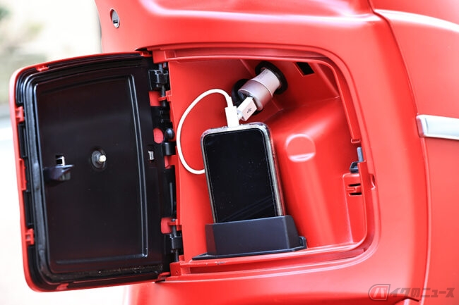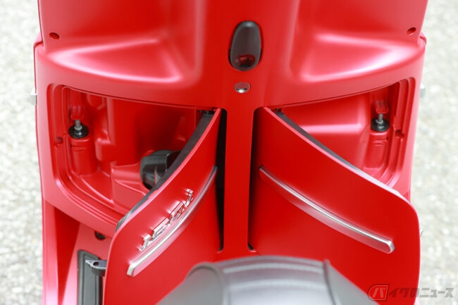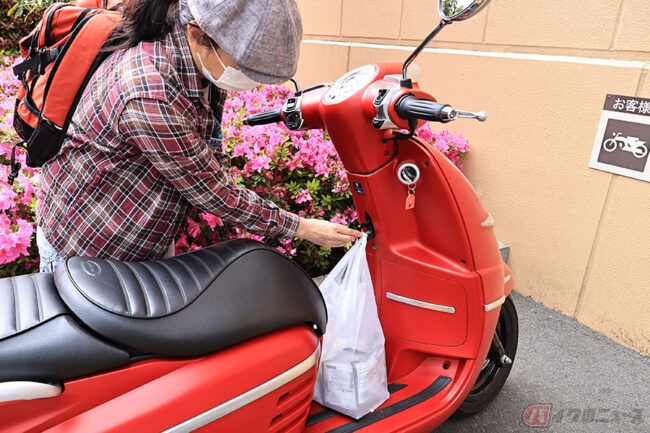ちなみに私がお気に入りポイントは、丸っこくて愛らしいフォルムとカラーリング、そして意外と収納力もあるところ! シート下にはトランクを装備、ヘルメットをひとつ入れてもゆとりのある大きさ。フロントパネルには荷掛けフックがあるので、レジ袋やエコバッグも掛けられます。