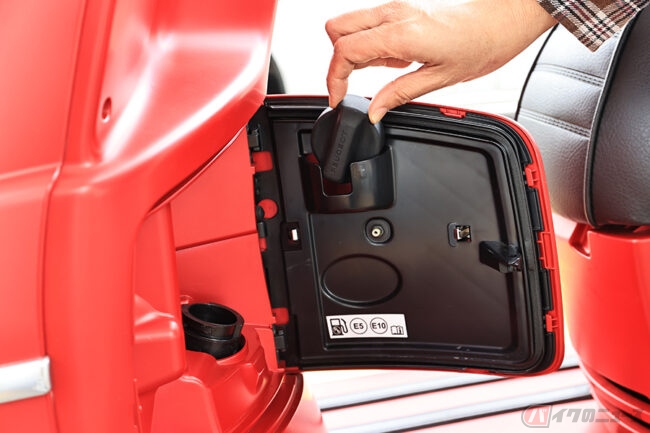 また、荷掛けフックのすぐ下には、左右に振り分けられたキー付きの開き扉があります。左側が燃料の給油口、給油キャップホルダーもついています。右には12Vアクセサリーソケットとポケット付きの収納になっていて、スマートフォンの充電もできちゃいます。かなり使い勝手はよさそうです。