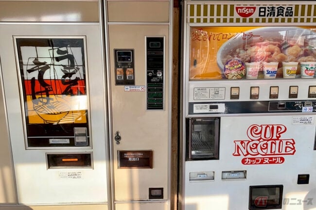 隣には、こちらも定番のカップヌードルの自販機がありました。昔は駅前などにも普通にあったものです。少年少女時代にお小遣いをもらって食べた人もいるのではないでしょうか。