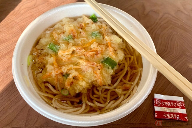 食べ盛りの成人男性には少し小ぶりかもしれませんが、暖かい天ぷらそばやうどんが300円で食べられます。懐かしいニキシー菅の加熱時間のタイマーを眺めながら、今か今かと待つ気持ちと、その時間がなんとも贅沢です。備え付けのお箸や七味はセルフで、出来上がったらいざすすります! やはりハズさない味、安心感がありますね。