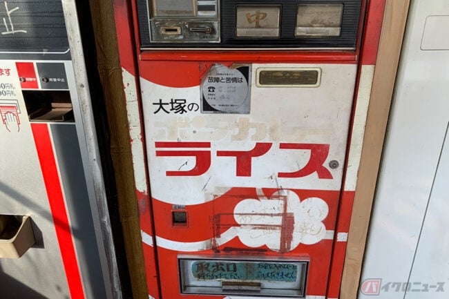 また店内には、なんとライス自販機まであります。温かいご飯が自販機で買えたようです。残念ながら故障しており、おそらく今後も復活することはないのでしょう。ほかにも味わい深いデザインのコーヒーやお菓子の自販機も、故障したまま置かれていました。