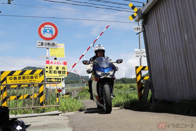 今回はフルカウルの大型バイクということもあり、実際にバイクで渡ろうとすると道幅がとてつもなく狭く感じます。そしてもうひとつ問題が……自転車やスーパーカブ、原付スクーターぐらいなら、遮断棒をヒョイと持ち上げても何とか抜けられそうですが、大型バイクだとそうはいきません。