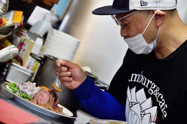 そして気になるお味! ハンバーグはボリューミーで、とってもジューシー!! 切る前から肉汁が溢れております。色んなハンバーグを食べてきたけど、こちらのハンバーグはただ美味しいだけじゃなく、ここでしか食べられない味でしたし、これはまた食べたくなっちゃう。ハンバーグに添えてあるパスタやお野菜の炒め物も店長が、一つ一つ丁寧に仕上げてくれているので、満足感たっぷり♪