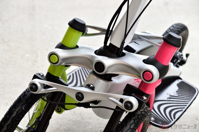 2017年の東京モーターショーに初出品された「トリタウン」は、ヤマハが開発したLMW機構(リーニング・マルチ・ホイール:モーターサイクルのように“傾斜して旋回する3輪以上の車両”の総称)を備えた、フロント2輪の小型電動立ち乗りモビリティです。ライダー自身のバランスコントロールによって姿勢制御を行なうシンプルな機構を取り入れ、ヤマハの社内アイデアコンテストから生まれました。