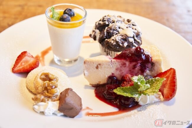 濃厚なチーズとブルーベリーのソースの奏でるハーモニーにさっぱりとした甘さのパンナコッタ。どうしたらいい?って、いうくらい甘くてコーヒーが進む笑顔になるチョコマフィンとちょこっとサイズのキップレンというクッキー。これに砂糖がいっぱいかかったミニパンケーキ。もうねぇ、デザートとコーヒーで私のお口の中はパラダイス! ダイエットってなんでしたっけ?って、言いたくなるくらい食べるって幸せ! このプチツーリングを終えるのにピッタリな贅沢盛り!編集長ありがとうございました! 食べることが大好きクリスさん、来週もとびっきりの贅沢ランチご紹介します!