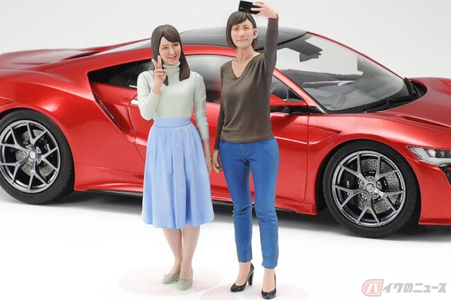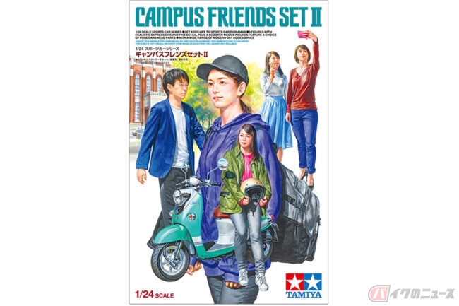 ヤマハ「ビーノ」に腰掛ける女性の模型を置いて、1/24スケールのワンシーンを楽しめるタミヤ「1/24 キャンパスフレンズセットII」の価格は2640円(消費税10%込み)です。