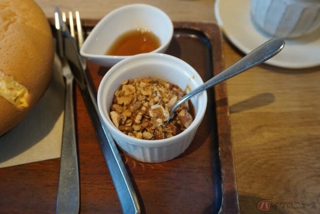 気になるお味は…ん~~~っ! 外は少しカリッとサクサクで中身はカステラのように生地がしっとりふわふわです。まさにパンケーキとカステラの良いとこどり。ソースもメープル、キャラメルソースともに美味しいですし、一緒に飲んだ青いお茶もさっぱりしていて苦くなく、カステラパンケーキとの相性抜群でした~。