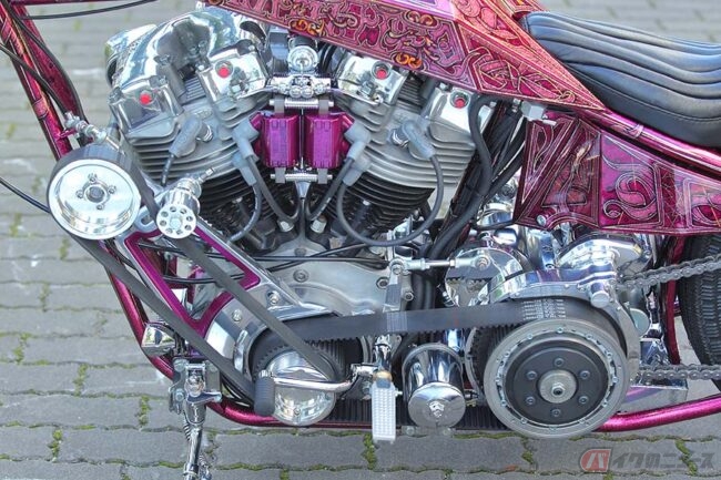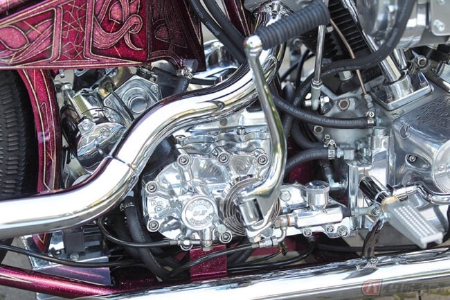 その中で目につくのが車体の左サイドに装着された巨大なスーパーチャージャーなのですが、これは1970年代に“ディガースタイル”を生み出したアメリカのビルダー、『アーレン・ネス』がマグナチャージャー社とタッグを組み、製品化したもの。