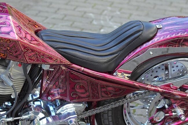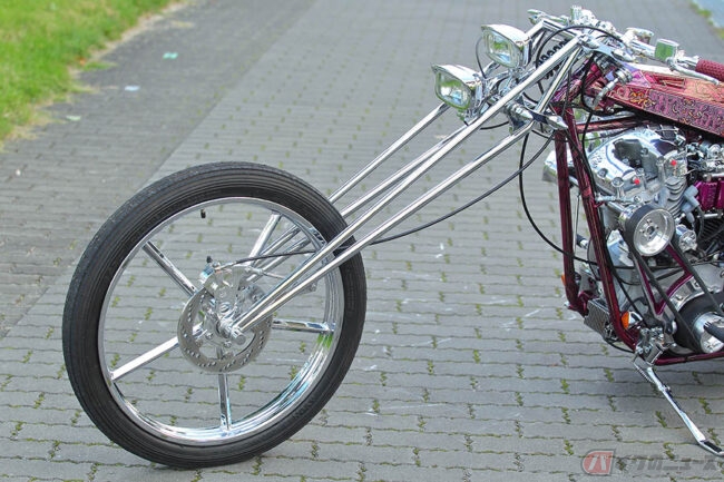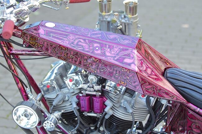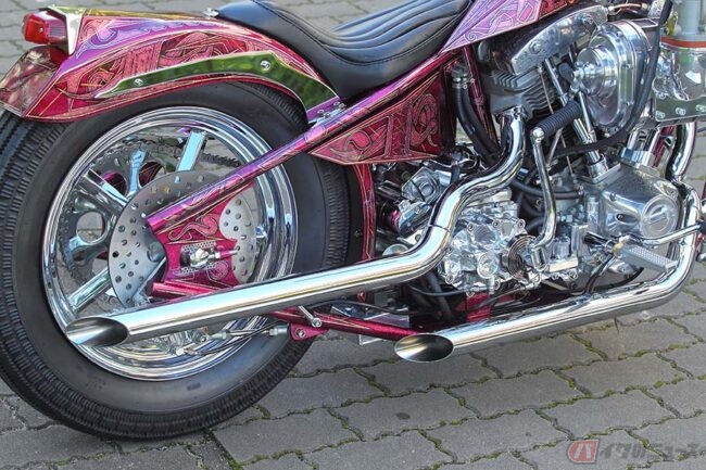 派手なギミックに目を奪われがちな“ディガースタイル”ですが、そうした部分を過剰に目立たせるのではなく、このマシンを前に「全体のスタイルとバランスに留意した」とビルダーの小田さんは語りますが、確かにそうした言葉にも納得するフィニッシュワークが与えられており、ワンオフ(一品もの)で製作されたフレームや鋭角的なデザインのロケットタンク、フリスコテールとなったリア周りなど、すべてが絶妙な仕上がりとなっています。