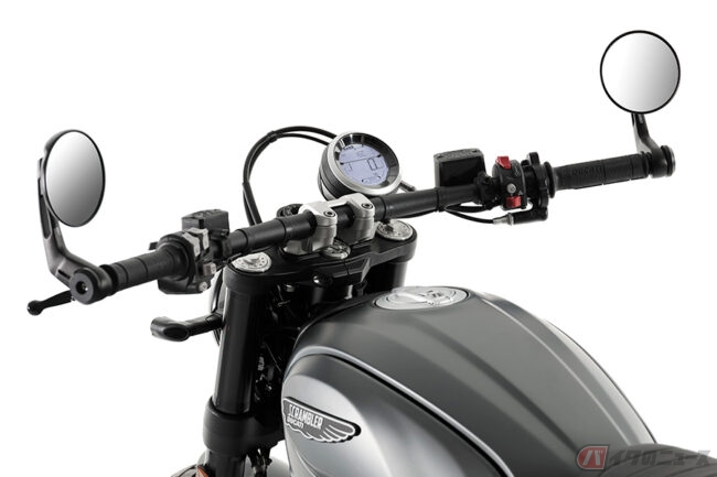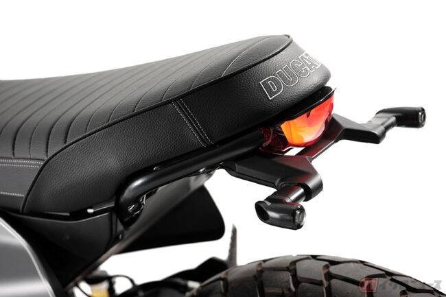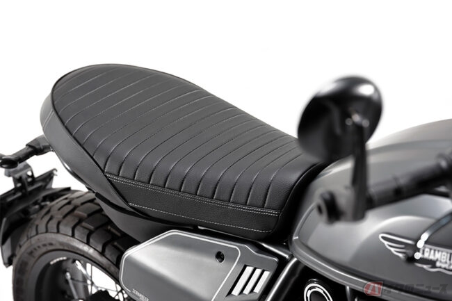 車体には幅の狭いストレートタイプのハンドルバーにバーエンドミラー、車体側面のゼッケンプレート、ワイヤースポークホイール、リアフェンダーを排除したスイングアームマウントのナンバープレートステーを装備するなど、視覚的にもコンパクトな印象となっており、シートは前後に長い一体型のフラットタイプを採用しています。