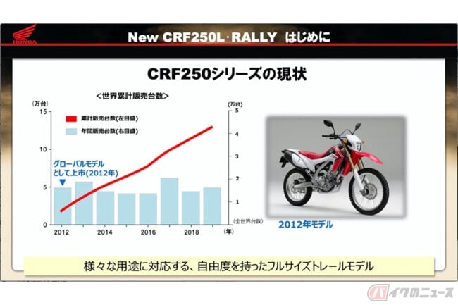「CRF250Lはオンロードからオフロードまで様々な用途に対応する、自由度を持ったフルサイズトレールモデルをリーズナブルな価格で世界中のお客様に提供したいという思いを込め、2012年にグローバルモデルとして登場しました。