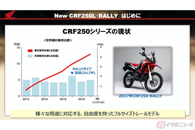 2017年にはオフ性能を有するツーリングモデルCRF250 RALLYタイプを追加するなど、CRF250Lシリーズは世界中のお客様から支持され累計販売台数は約13万台を超え(※売上世界一は日本市場)、今なおお客様から高い評価を頂いております。